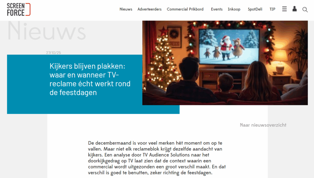 Eind oktober 2025 publiceerde Screenforce een artikel over hoe kijkers blijven hangen bij reclameblokken, zowel rond de feestdagen als daarbuiten. Dat artikel is hier te lezen. Uiteraard is nog veel meer over te vertellen over schakelgedrag. Wil je meer weten, neem dan contact op.